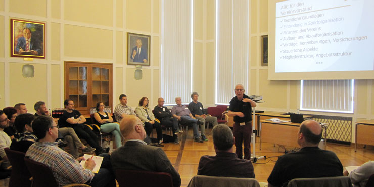 Rechtliche Grundlagen, steuerliche Aspekte, Versicherungen und vieles mehr, die Anwesenden hörten aufmerksam zu und stellten interessiert Fragen, von denen keine unbeantwortet blieb. Bei einem leckeren Imbiss gab es anschließend die Möglichkeit sich zu stärken und sich auszutauschen, bevor BSB-Referent Sigi Bütefisch in seinem motivierenden Impulsvortrag die Grundprinzipien und die enorme Bedeutung von Kommunikation intern wie extern aufzeigte. Anschaulich führte er seinen Zuhörern vor Augen über welche Stellschrauben sie eine individuelle Kommunikation gestalten und so ein gutes Klima im Verein und ein positives Bild nach außen schaffen können. Diese neuen Anregungen konnten von den Vereinsvertretern im Anschluss direkt in die Diskussionen an den Thementischen eingebracht werden. Angeregt wurde zu Themen wie Mitgliedergewinnung und –bindung oder Öffentlichkeitsarbeit diskutiert und der ein oder andere Kontakt zwischen den Vereinen geknüpft.