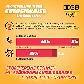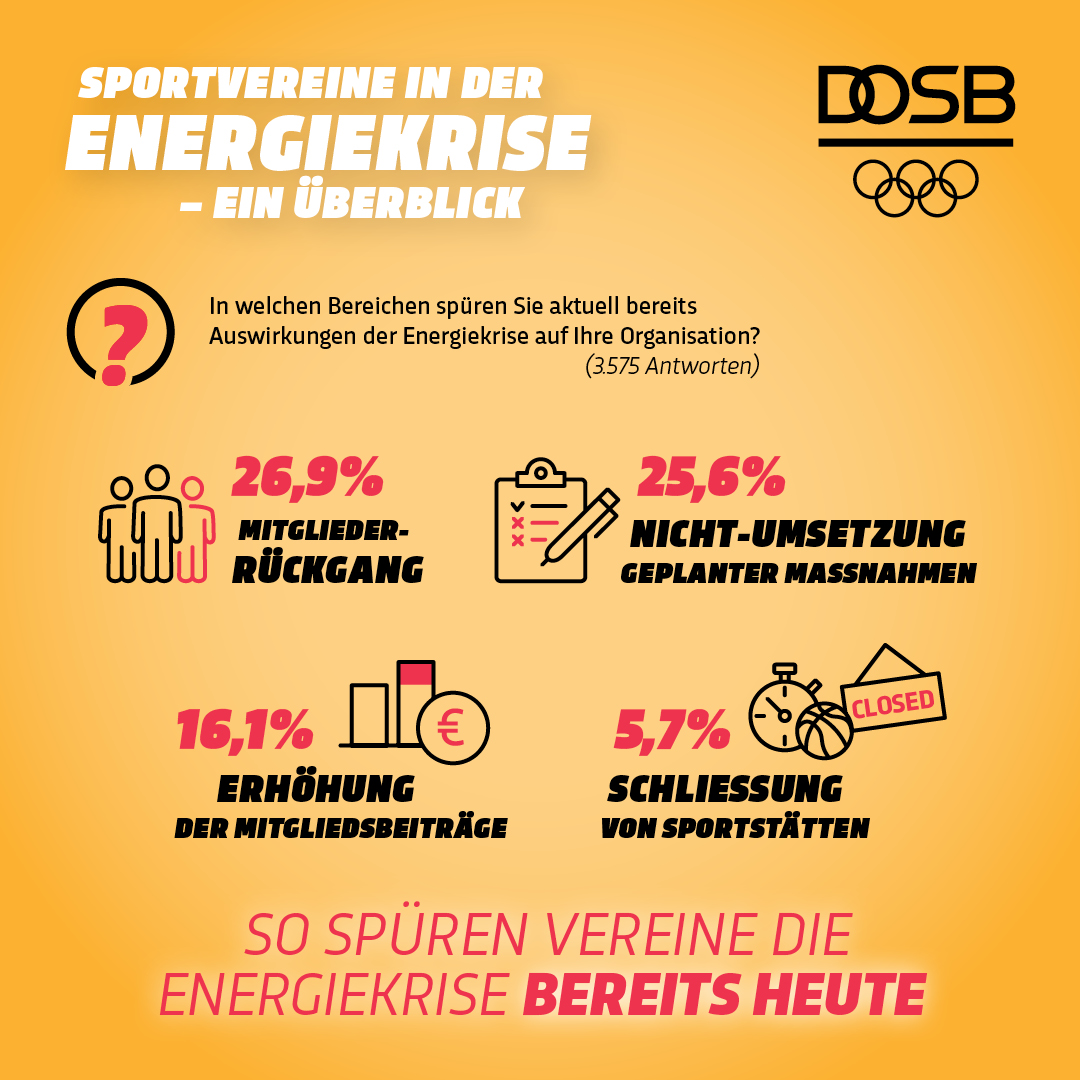 Für viele Vereine sind die Auswirkungen der Energiekrise bereits jetzt zu spüren. So gab mehr als ein Viertel der befragten Vereine an, dass sie einen Mitgliederrückgang aufgrund der aktuellen Krise zu verzeichnen haben. In mehr als 5% der Fälle mussten bereits Sportstätten geschlossen werden.