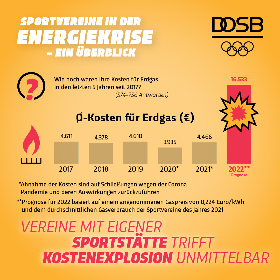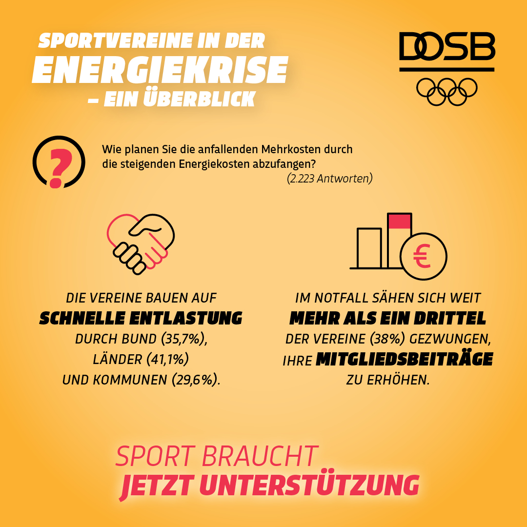 Bereits Anfang September hatte der DOSB seine Mitglieder dazu aufgerufen, im Sport 20% Energie einzusparen und einen entsprechenden Stufenplan und Leitfaden erstellt. Die aktuellen Zahlen belegen jedoch, dass selbst beim Erreichen des gesteckten Ziels hohe Mehrbelastungen zu erwarten sind.