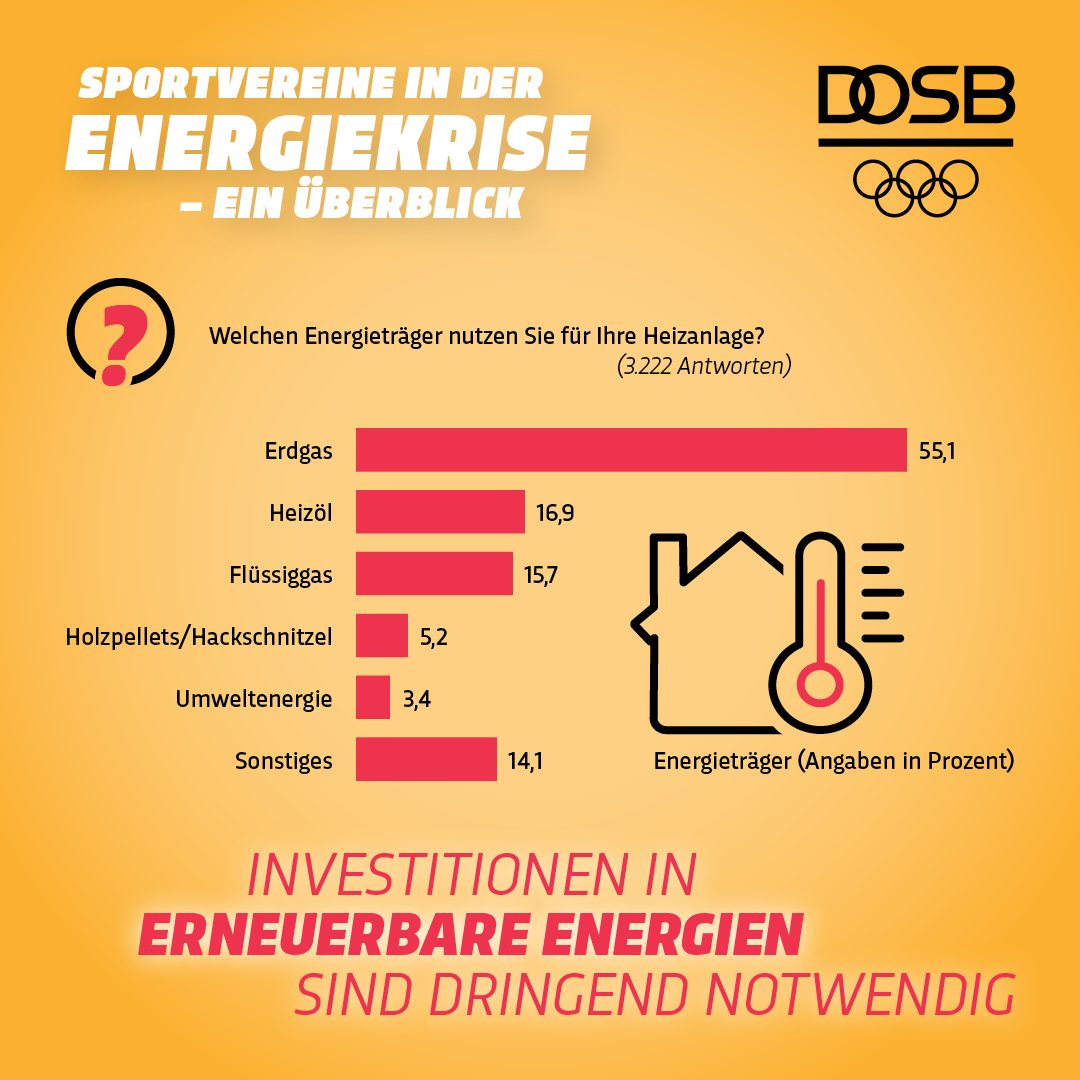 Michaela Röhrbein, DOSB-Vorständin Sportentwicklung, sieht auch langfristig Handlungsbedarf: „Laut Umfrage heizen mehr als 50% der Vereine mit eigener Sportanlage mit Erdgas. Viele Jahre wurde diese Energieform vom Staat gefördert, ist seit der Energiekrise aber nicht mehr tragbar. Spätestens jetzt dürfen die Vereine nicht mehr allein gelassen werden und brauchen Unterstützung bei der Umstellung auf erneuerbare Energien. Die Sportstätten in Deutschland sind zudem dringend sanierungsbedürftig – es müssen umfassende Modernisierungs- und Dekarbonisierungsmaßnahmen durchgeführt werden. Der Ausbau der erneuerbaren Energien im Sport kann einen wichtigen Beitrag zur Erreichung der Klimaziele in Deutschland sowie zur Reduzierung der Abhängigkeit von Erdgas leisten. Dies entsprechend zu unterstützen, sollte auch der Politik ein wichtiges Anliegen sein.“