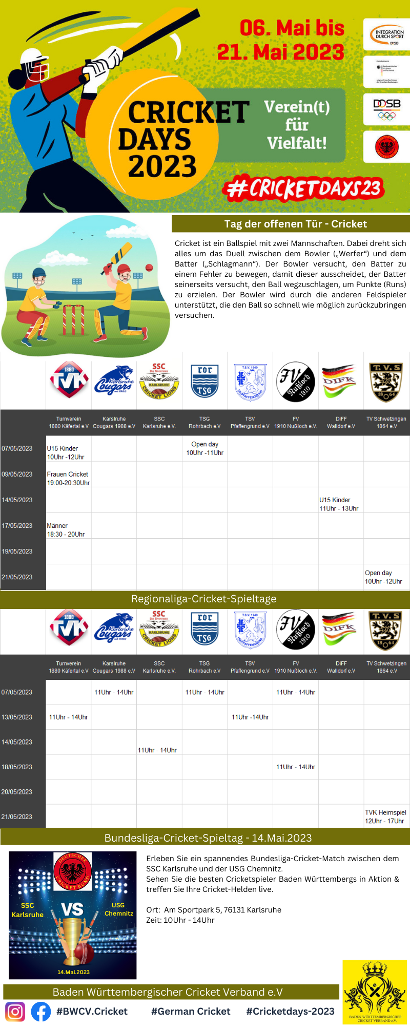 Zum zweiten Mal finden die IdS-Cricket-Days statt. Vom 06. Bis zum 21. Mai führen Cricket-Vereine in ganz Deutschland Aktionen und Veranstaltungen durch, um den Sport zu präsentieren. Schnupperangebote für Kinder, Probetrainings für Frauen und Tag der offenen Tür bei Cricket-Abteilungen gehören zum Veranstaltungsprogramm. Auch die Cricket-Vereine in Nordbaden beteiligen sich mit vielfältigen Aktionen an den Cricket-Days, um Mitspieler*innen für den Sport zu begeistern.