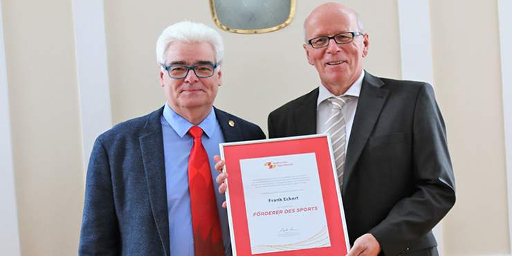 Auf Beschluss des BSB-Präsidiums wurde in der vergangenen Woche Frank Eckert anlässlich seiner Verabschiedung in den Ruhestand als "Förderer des Sports" ausgezeichnet. Aus den Händen von Jürgen Zink, Vertreter der Sportkreise im BSB-Präsidium und Vorsitzender des Sportkreises Bruchsal, erhielt er als erst fünfte Person die Urkunde. Zink würdigte dessen Verdienste für den Sport als "Antreiber und Visionär", der Bruchsal zur Sportstadt entwickelt hat.